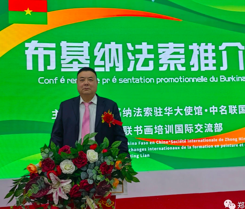 (中名聯(lián)文創(chuàng)園圖片說明:布基納法索共和國駐華大使館領(lǐng)導(dǎo)帕爾﹣伊薩﹣約瑟夫先生上臺(tái)演講,明確表示非常開心在中名聯(lián)國際展廳舉辦布基納法索國家推介會(huì))